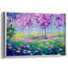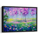 Step into the enchanting world of 'Serenade of Whispering Blossoms: A Vibrant Impressionist Landscape,' a mesmerizing canvas art that beckons viewers into a tranquil, blooming forest filled with the fragrance of fresh blossoms. This captivating artwork showcases a cluster of trees painted in vivid shades of lavender and violet, basking in a gentle, diffused light reminiscent of early morning or late afternoon hues.