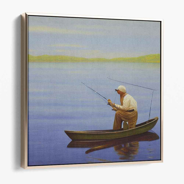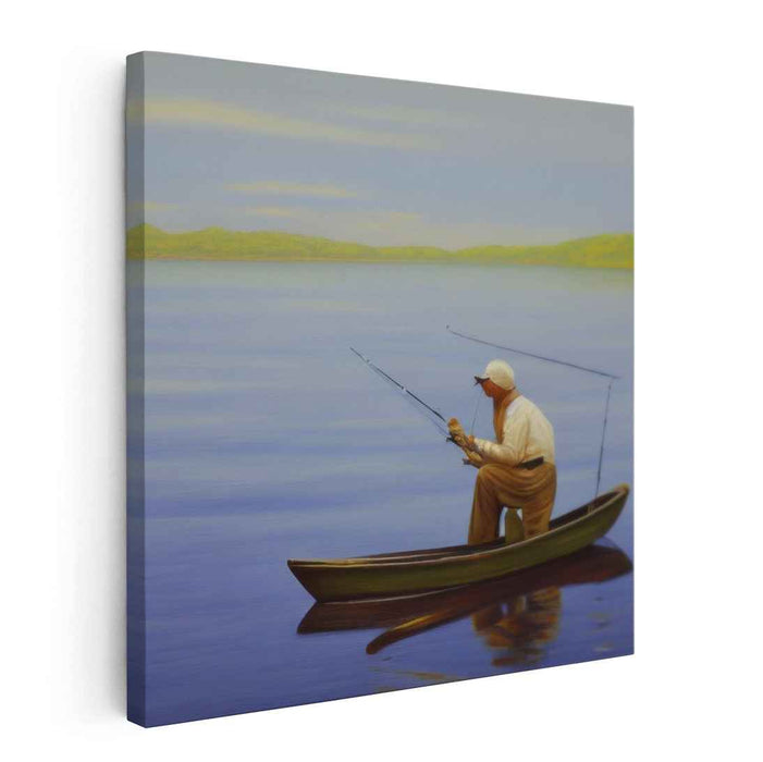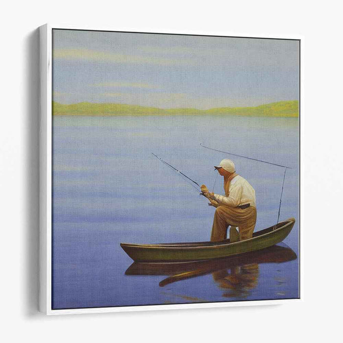 Introducing "Serene Angler," a mesmerizing canvas art print capturing a tranquil moment of a fisherman on a serene lake. This captivating artwork immerses viewers in a scene of serene beauty, where a fisherman in a white shirt and hat, adorned with beige trousers, focuses intently on his fishing rod in a small boat.