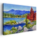 The canvas comes alive with a vibrant blue, mirroring the clear sky and the mirror-like lake surface. Lush greens of the surrounding foliage, warm oranges, and deep reds of autumnal trees dance harmoniously, painting a vivid and serene landscape. The artist's blend of primary and secondary colors creates a visual feast that speaks to the soul.