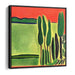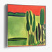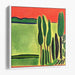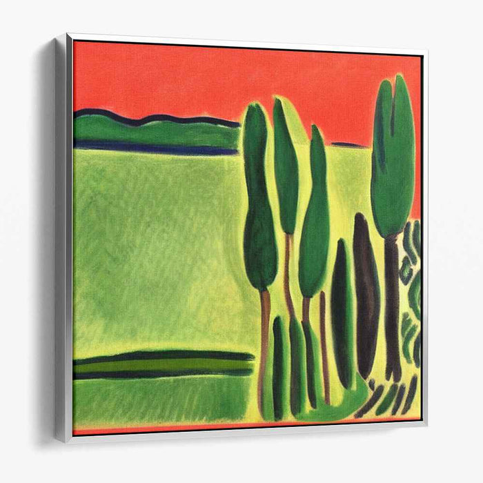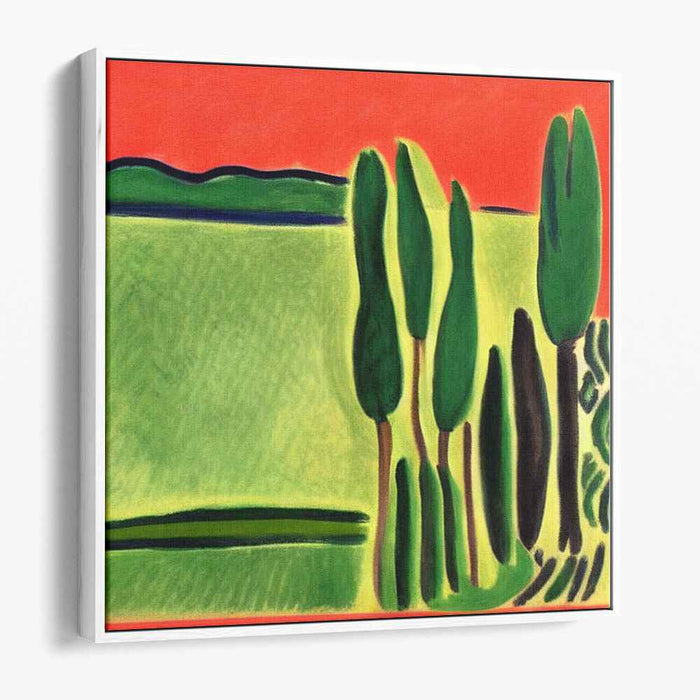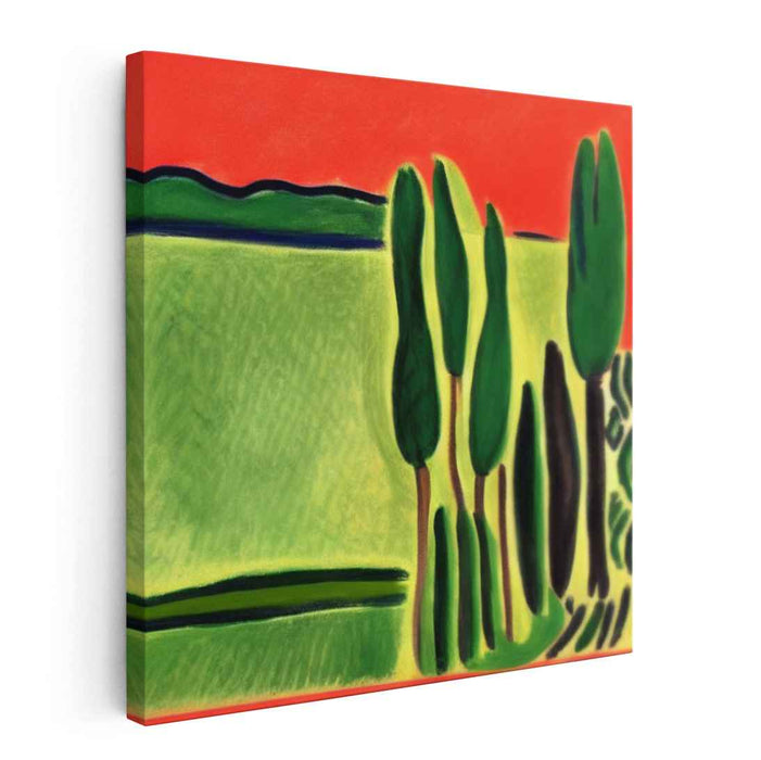 Introducing "Serene Cypress Landscape," a captivating canvas art print that vividly portrays a serene and striking landscape. The artwork features a bold red sky that immediately captures the viewer's attention, setting the stage for a scene dominated by lush, green cypress trees standing tall and proud. These stylized trees, with their elongated and simplified forms, exude a sense of calm and stability, creating a harmonious contrast against the various shades of green covering the ground.