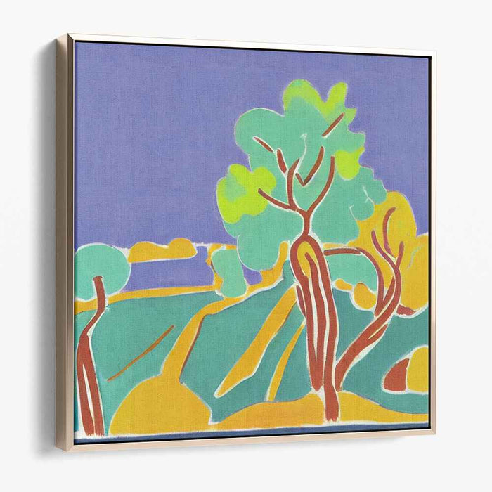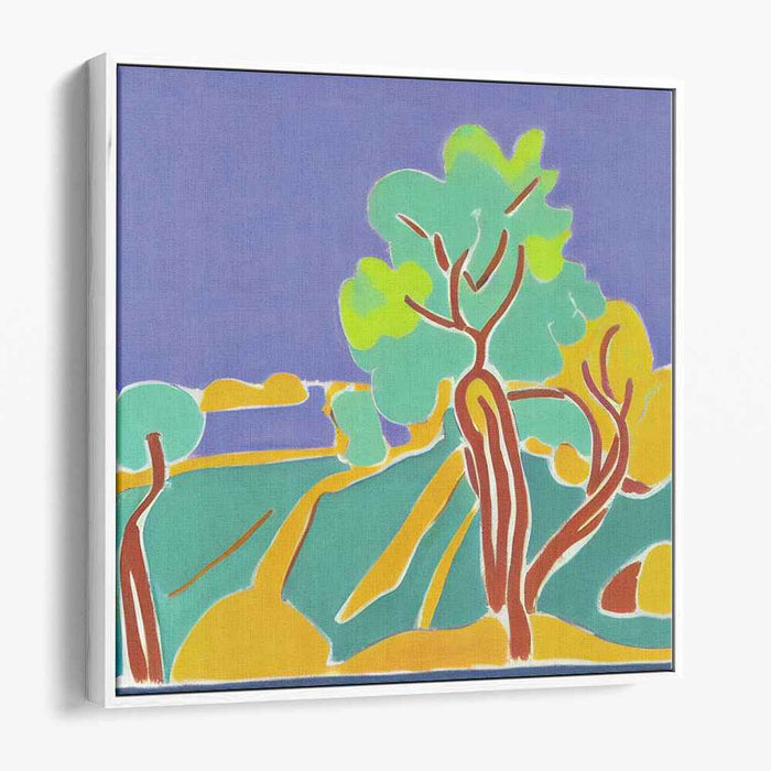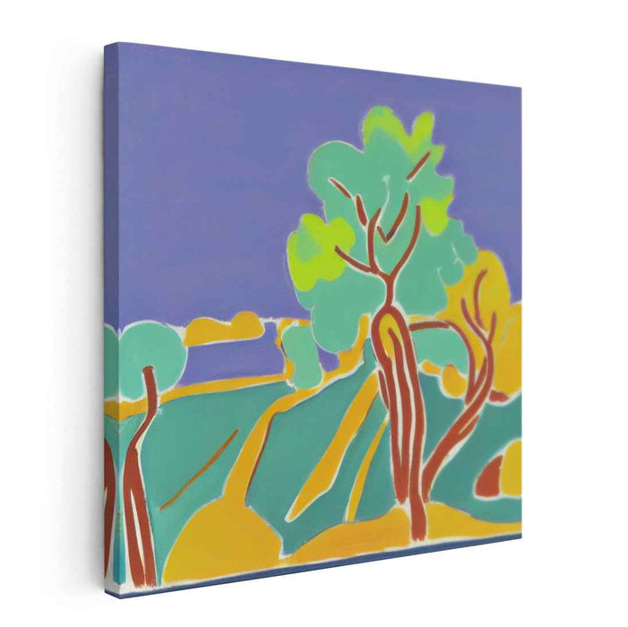 Introducing 'Serene Pastoral Harmony,' an enchanting canvas art print that mesmerizes viewers with its vibrant yet tranquil landscape. This captivating artwork showcases elegantly simplified trees, gracefully twisting against a backdrop of rolling hills and a clear sky, creating a harmonious and calming scene.