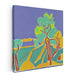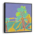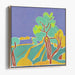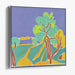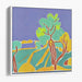 The lush green trees pop against the lilac sky and mustard yellow ground, forming a striking contrast of warm and cool tones. The bold yet simplistic composition, characterized by fluid lines and blocks of color, exudes a timeless beauty that radiates tranquility and harmony.