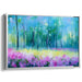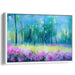 The foreground of this artwork features a lively meadow adorned with a profusion of pink and purple flowers, their delicate petals depicted with bold, expressive brushstrokes that seem to sway with a gentle breeze. The artist's masterful use of primary blues and greens, interspersed with secondary tones of pink, purple, and yellow, and impressionistic techniques, captures the vitality and freshness of the natural world, inviting viewers to immerse themselves in its vibrant beauty.