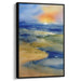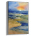 The artist's skillful use of watercolor techniques is evident in the soft blending of colors and delicate brushstrokes that infuse the piece with a sense of fluidity and movement. The sandy shoreline in warm earth tones gently leads the eye towards the stunning sunset, enhancing the artwork's immersive quality and inviting contemplation.