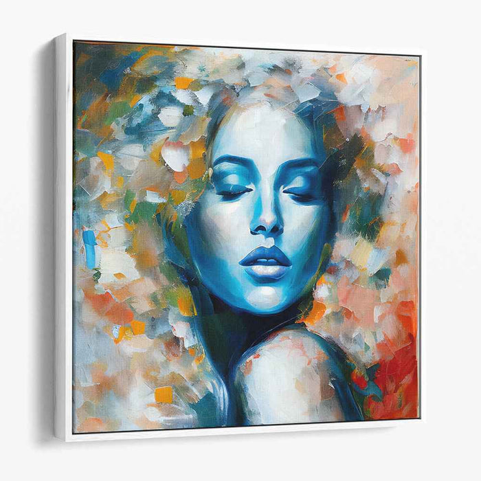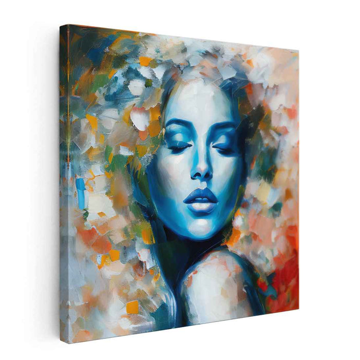Introducing 'Serenity in Blues,' a mesmerizing canvas art print that captures the essence of tranquility through a portrait of a woman enveloped in a harmonious blend of blues, accented by vibrant pops of orange, white, and green. The central figure, with eyes peacefully closed, exudes a sense of dream-like serenity, inviting viewers into a world of calm contemplation.