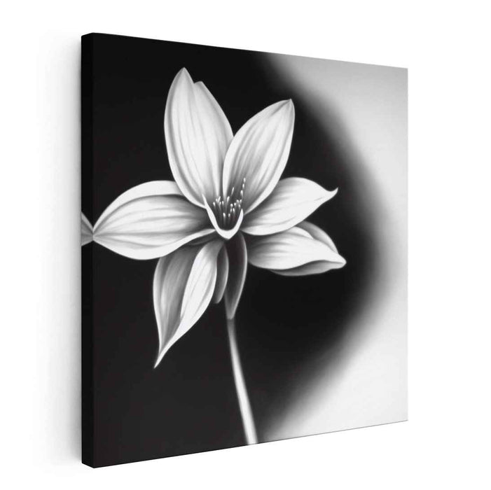 Introducing "Shadows of Elegance," a mesmerizing monochrome still life canvas art that mesmerizes viewers with its exquisite portrayal of a delicate lily flower in a captivating play of light and shadow. This artwork, rendered in shades of black, white, and gray, commands attention with its striking contrast and ethereal beauty.