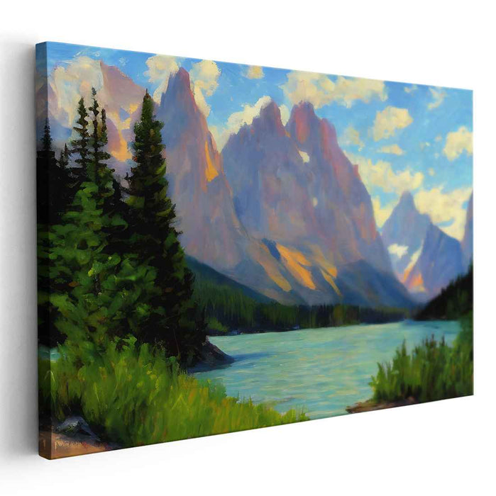 Introducing "Silent Giants in Serenity: Tranquil Landscape with Majestic Peaks," a mesmerizing landscape canvas art that transports viewers to a serene mountain lake nestled amidst towering peaks and lush greenery. This captivating artwork captures a tranquil oasis where the magnificence of the mountains is mirrored in the serene waters of the lake, enveloping the scene in a harmonious and peaceful ambiance.