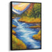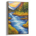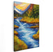 Introducing "Silent Sentinel Peaks: Majestic Mountain Landscape Canvas Art Print," a mesmerizing piece that beckons viewers into a tranquil riverside setting, embraced by grand mountains. This captivating artwork depicts a river meandering gracefully through a lush, green valley, its vibrant blue waters skillfully painted to contrast with the golden tones of the surrounding flora.