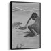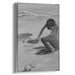 Introducing 'Silent Shore,' a mesmerizing monochrome portrait canvas art that captures a poignant moment on a tranquil beach, where a lone figure engages in the serene act of drawing or writing in the sand. This evocative artwork, primarily composed in shades of gray, skillfully plays with light and shadow to evoke a profound sense of introspection and solitude.