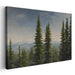 The foreground of this painting is dominated by majestic pine trees, meticulously depicted with textured brush strokes that bring the foliage to life. These towering trees elegantly frame the composition, guiding your gaze towards the distant mountains painted in soft, misty hues that convey a sense of depth and tranquility. The sky above transitions from a gentle dawn pink to a subtle gray, casting a soft morning glow over the entire scene.