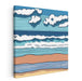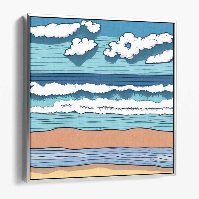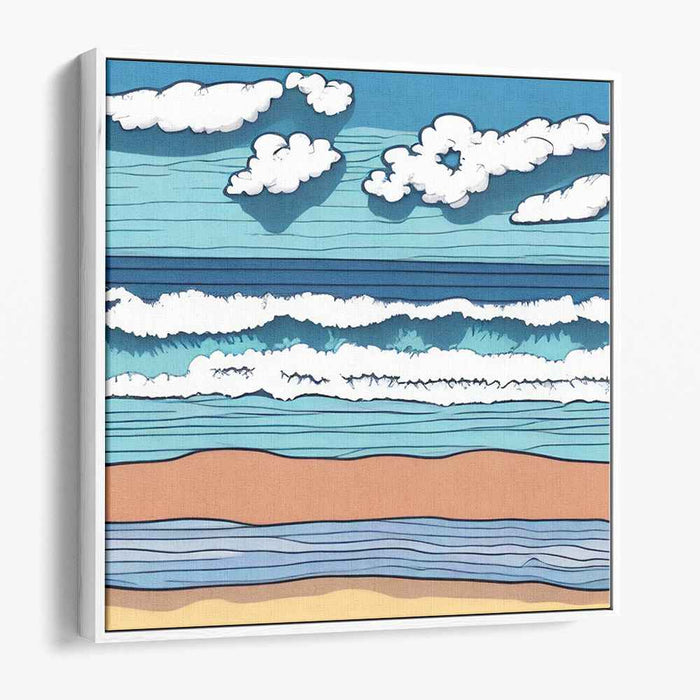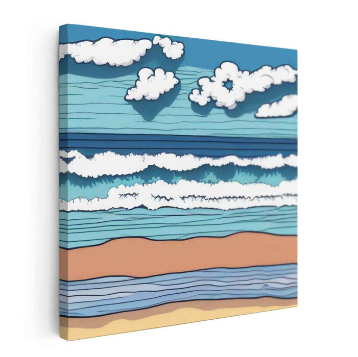 The composition is a harmonious blend of vibrant blue skies adorned with whimsical, fluffy clouds and the gentle, varying shades of blue and white ocean waves softly kissing the shore. The sandy beach, depicted in warm tones of beige and brown, elegantly contrasts with the cool blues, creating a visually captivating and balanced scene that invites contemplation.