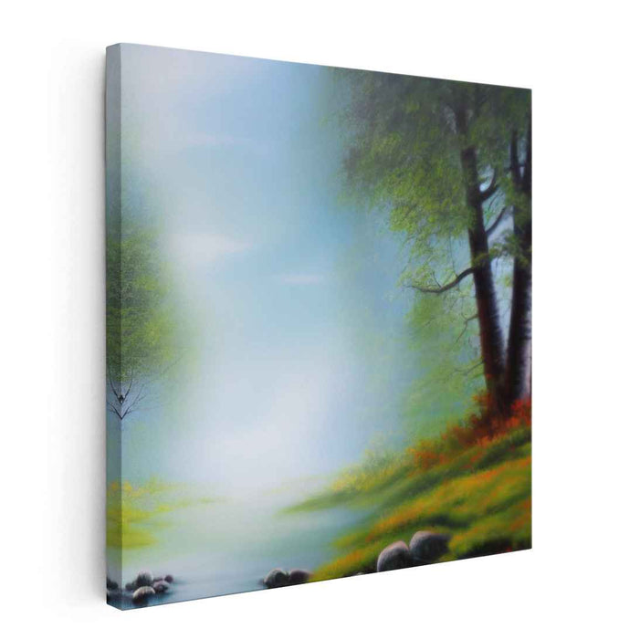 Introducing 'Soothing Earth Sketches: Serene Landscape Canvas Art Print,' a captivating masterpiece that transports viewers into a magical, misty forest where nature's tranquility reigns supreme. This enchanting artwork depicts a serene scene where a gentle stream meanders through lush greenery, flanked by tall, majestic trees, creating a sense of peace and wonder.