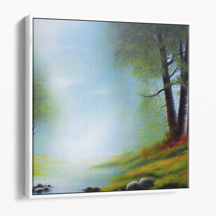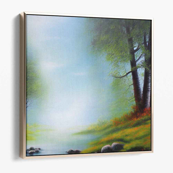 Reminiscent of renowned landscape artists like Claude Monet and Albert Bierstadt, this artwork beautifully captures the essence of natural beauty and serenity. Categorized under Romanticism and Impressionism, the piece emphasizes emotion and the sublime beauty of nature, inviting viewers to immerse themselves in the tranquil forest setting.