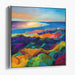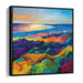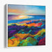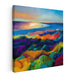 Step into the mesmerizing world of 'Stormy Palette: A Vivid Seascape in Colorful Expressionism,' a captivating canvas art print that exudes a symphony of color and light across a breathtaking coastal panorama. This artwork showcases a vibrant foreground, where undulating hills come alive in a kaleidoscope of deep purples, fiery reds, lush greens, and sunny yellows, forming a visual tapestry that commands attention.