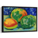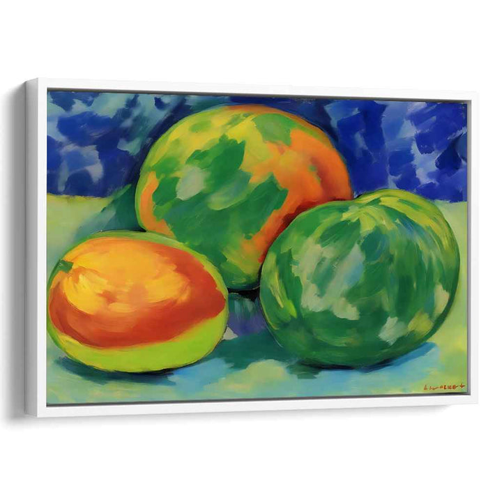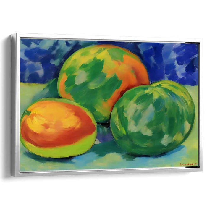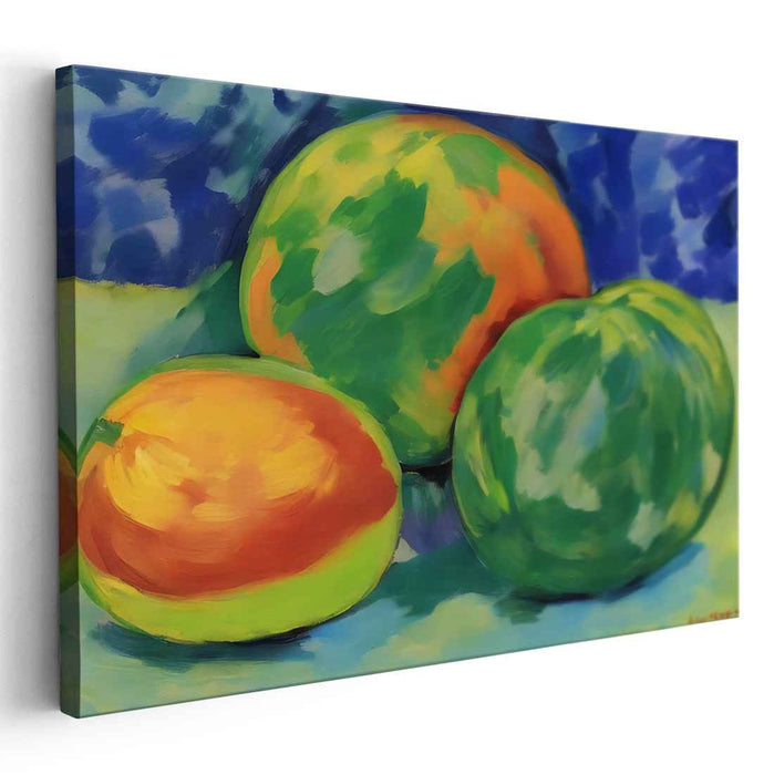 The focal point of the artwork is the largest watermelon, exquisitely painted with a blend of green and orange hues that create a sunlit effect, emphasizing its round and robust form. Flanked by two smaller companions—one in a deep, rich green and the other in a bold orange—the trio offers a visually striking contrast that is both captivating and thought-provoking.