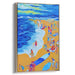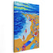 The canvas bursts with bold blues symbolizing the vast ocean and sunny yellows representing the sandy beach. Complementing these primary colors are the secondary hues of reds, oranges, and greens, enhancing the lively and colorful ambiance of the scene, creating a vibrant tapestry of summer joy.