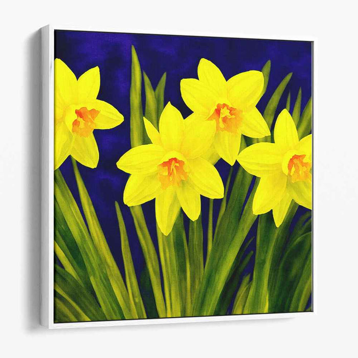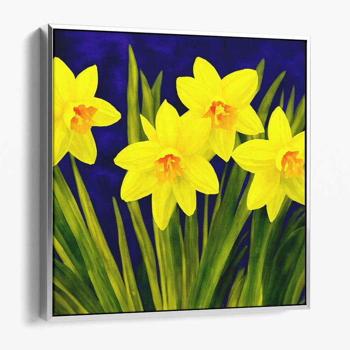 Introducing "Sunburst Petal Symphony," a vibrant yellow floral canvas art print that exudes the beauty and vitality of springtime with its stunning depiction of bright yellow daffodils in full bloom. Set against a deep, rich blue background, the bouquet of daffodils stands out with its trumpet-shaped blossoms and intricate, elongated petals, meticulously detailed to capture the delicate textures of each petal and leaf.