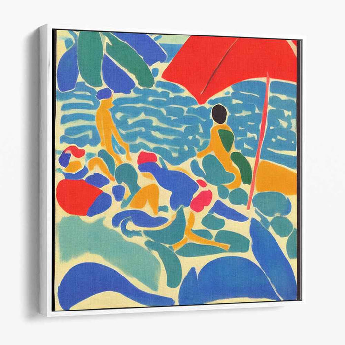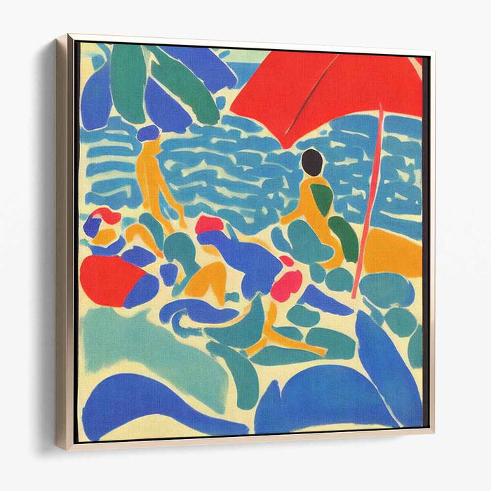 Introducing 'Sunny Beach Day,' a vibrant Fauvist beach scene canvas art print that transports viewers to a lively seaside setting, basking in the warmth of a sunny day by the sea. This dynamic artwork captures the essence of carefree beach moments with its bold and simplified figures lounging under a striking red umbrella, while the ocean waves gently caress the shore in the background.