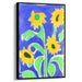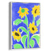Introducing "Sunny Blooms Dance: Bright and Cheerful Sunflower Canvas Art," a captivating piece that radiates joy and vibrancy, featuring a trio of sunflowers standing tall against a bold blue backdrop. This artwork, crafted in a modern and abstract style, captures the essence of cheerfulness and positivity through its bright yellow petals, dark brown centers, and fresh green stems.