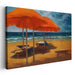 Introducing 'Sunny Coastal Repose,' a captivating canvas art print that transports viewers to a serene and vibrant beach scene, brimming with bold colors and dynamic brushwork. This artwork features a dominant, vivid orange beach umbrella in the foreground, creating a striking contrast against the azure blues of the sky and sea.
