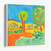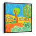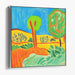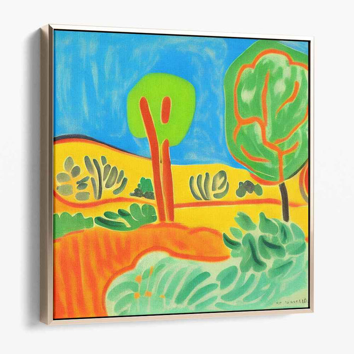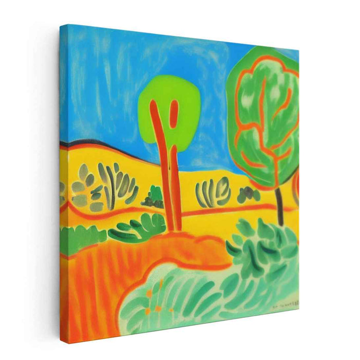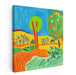 The artist's bold use of primary colors like blue, green, and yellow, complemented by secondary shades of orange and light green, creates a dynamic visual experience. The simplified yet bold outlines of the trees add a touch of whimsy to the scene, while the warm yellows and oranges of the rolling hills in the background evoke a sense of warmth and tranquility.