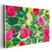 The composition is a harmonious blend of lush pink roses that energetically burst from the canvas, surrounded by verdant green leaves that offer a captivating contrast. The background painted in a warm, sunny yellow hue serves as a radiant stage, enhancing the vividness of the flowers and infusing the piece with a feeling of warmth and joy.