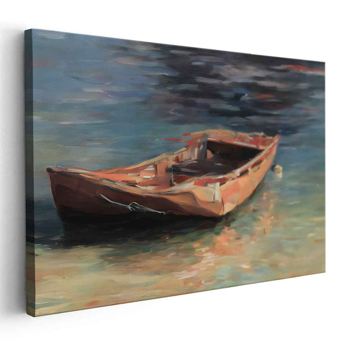 The central focus of this piece is the solitary boat, set against a backdrop of rich blues and vibrant oranges that create a captivating contrast, drawing the eye to the heart of the composition. The water is masterfully rendered with fluid, sweeping brushstrokes that convey the gentle ripples and reflections of the ever-changing sky above. The boat itself, painted in warm earth tones and oranges, exudes a sense of resilience and enduring strength, adding a narrative layer of timelessness to the scene.