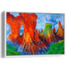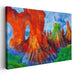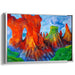 The artist's bold use of color creates a surreal terrain where towering peaks in shades of green, yellow, and blue dance around the dominant reds and oranges, infusing the scene with a sense of otherworldly wonder. The expressive brushstrokes add a dynamic energy to the landscape, as if the very rocks are alive and in motion.