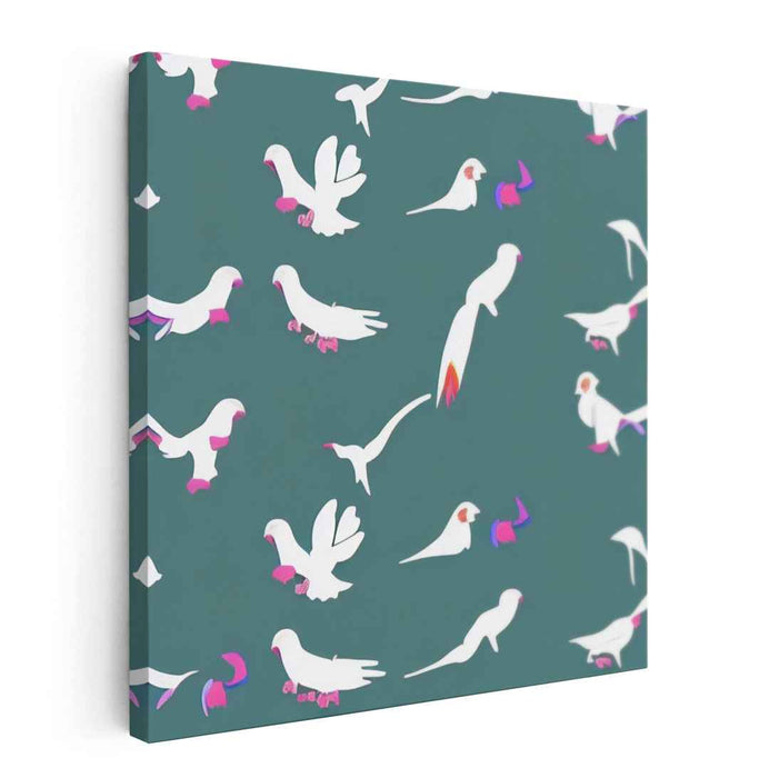 Introducing 'Teal Aviary,' a mesmerizing canvas art print that captures the graceful beauty of birds in flight and at rest, creating a serene and whimsical ambiance that enchants any space it adorns. This captivating artwork features a variety of birds elegantly portrayed in a minimalist style, characterized by smooth, flowing lines and a soft, matte finish.