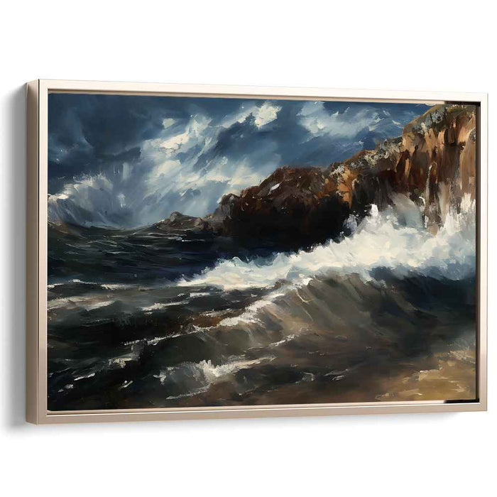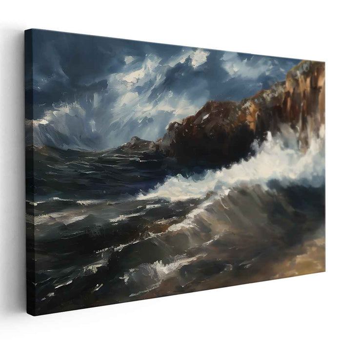 Introducing 'Tempestuous Seashore Drama: Dramatic Coastal Storm,' a mesmerizing canvas art print that encapsulates the unbridled power of the ocean clashing against a rugged coastline. This artwork immerses viewers in a scene where the sea's raw energy is on full display, depicted through tumultuous waves in deep shades of blue and white, conveying a palpable sense of movement and vitality.