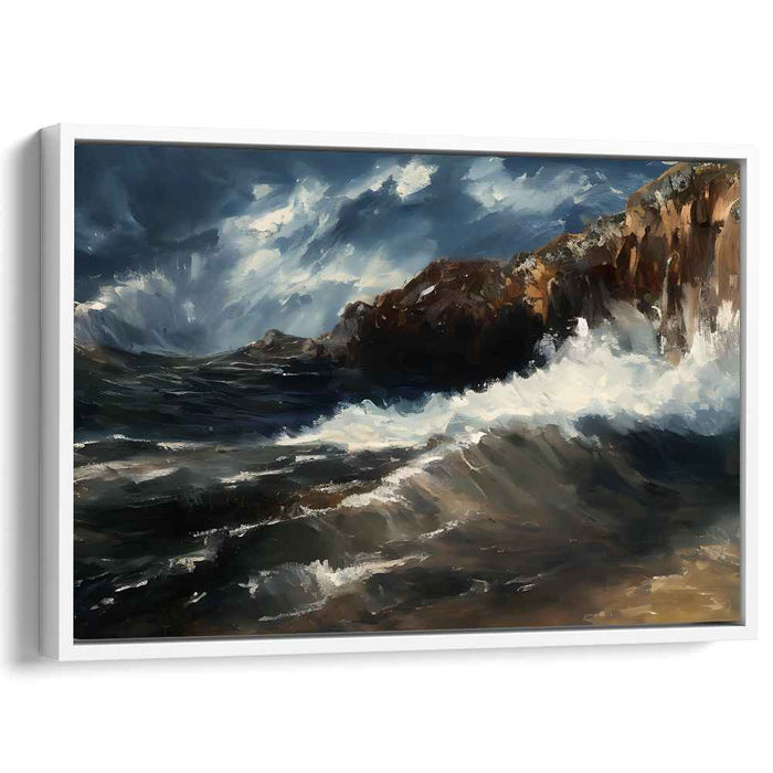 The composition is dominated by a turbulent ocean, its waves frothing and swirling with a fierce intensity, contrasted against a stormy sky filled with swirling clouds foretelling an imminent tempest. The sturdy cliffs, painted in earthy browns and reds, defiantly withstand the relentless assault of the waves, their rugged textures meticulously portrayed to exude resilience and power.