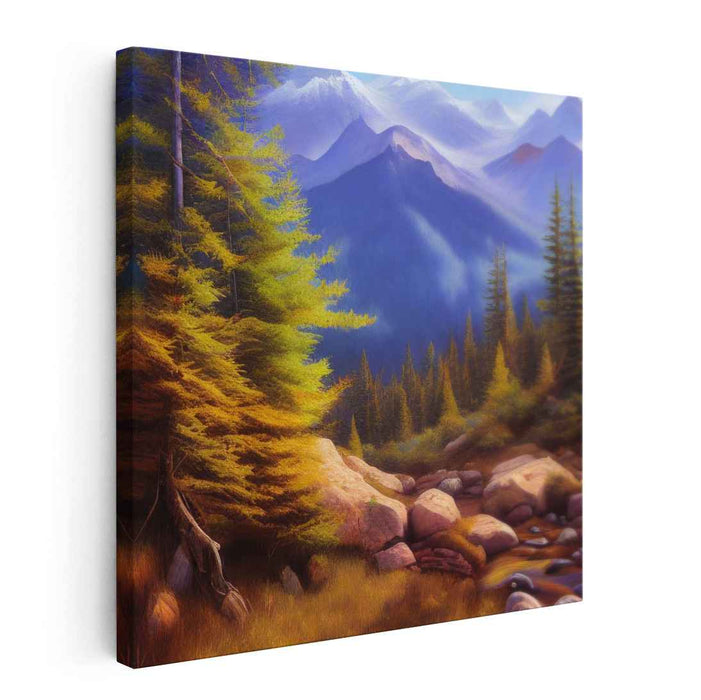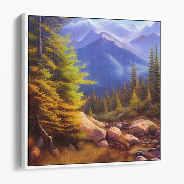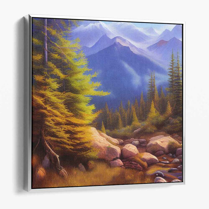The foreground of the painting showcases a tranquil stream winding its way through a rocky terrain, bordered by lush evergreen trees and moss-covered boulders. In the backdrop, majestic mountains emerge, veiled in a soft, misty haze that adds a sense of depth and grandeur to the scene. The color palette is a symphony of vibrant greens, deep blues, and earthy browns, with the sunlit areas providing a striking contrast that amplifies the natural beauty of the setting.