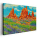 The artwork features towering, jagged red rocks rising from a lush field of wildflowers in vibrant orange-red hues, beautifully contrasted by the deep blues and turquoises of the sky. The secondary colors of green, purple, and yellow in the wildflowers create a harmonious and lively palette that adds depth and richness to the composition.