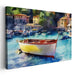 The focal point of this artwork is the striking boat, painted in serene shades of white, yellow, and a hint of red, gently swaying in the foreground against the crystal-clear waters. In the backdrop, charming houses with terracotta roofs and pastel-colored walls blend harmoniously with a lush, green hillside, creating a scene straight out of a Mediterranean postcard.
