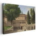 The composition is enriched by verdant green trees and majestic cypress trees that elegantly frame the courtyard, heightening the tranquil and ageless ambiance. Figures in period attire in the foreground infuse a human element, hinting at the daily narratives unfolding within this peaceful oasis. Masterfully playing with light and shadow, the artist bathes the courtyard in sunlight, casting a warm and inviting glow over the scene.