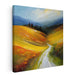Introducing "Tranquil Field Harmony: Serene Countryside Landscape Canvas Art Print," a mesmerizing piece that whisks viewers away to a tranquil countryside setting, where a meandering path winds through lush rolling hills bathed in the golden glow of late summer or early autumn. The artwork's vibrant palette of yellows and oranges captures the warmth and serenity of a sun-kissed day, while the sky transitions from a gentle blue to a deeper azure, hinting at the magical hours of dawn or dusk.