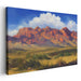 The canvas art showcases a majestic range of mountains that stand as sentinels against a brilliant blue sky adorned with fluffy white clouds, imparting a sense of serenity and vastness to the scene. The foreground depicts an arid land teeming with resilient green vegetation, hinting at the thriving life within the harsh desert environment.