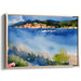 Introducing "Tranquil Palette: Serene Watercolor Landscape," a mesmerizing artwork that immerses viewers in a tranquil coastal setting, where a charming village rests against a backdrop of verdant hills and the vast, azure sea. This serene scene, depicted in a soothing watercolor style, captivates with its fluidity and seamless color transitions.