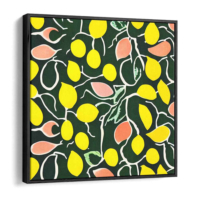 Brighten up your space with 'Tropical Mirage Melodies: A Vibrant Summer Fruit Canvas Art Print,' an invigorating and delightful artwork that encapsulates the essence of summer through its vibrant portrayal of citrus fruits. This captivating piece showcases beautifully stylized lemon and orange slices intertwined with lush green leaves against a profound black backdrop.
