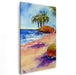The foreground of this painting invites you to golden sands kissed by hints of pink, reminiscent of a sun's final farewell. Two sturdy rocks, painted in rich browns and shadows, anchor the scene, infusing it with depth and intrigue. The cerulean sea, adorned with frothy white waves, dances in contrast to the sandy expanse, guiding your gaze towards the distant horizon. Above, verdant palms rustle against a canvas of light blues and soft whites, completing this tropical symphony.