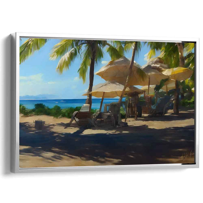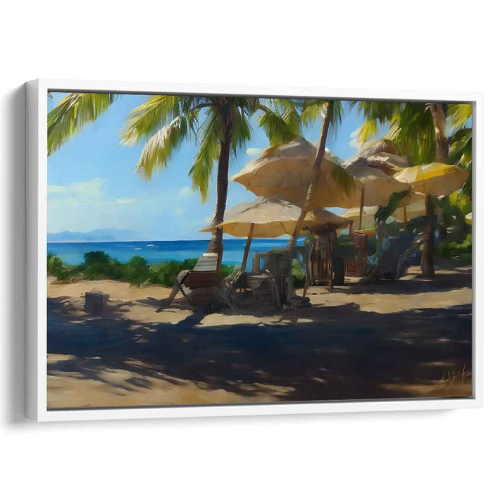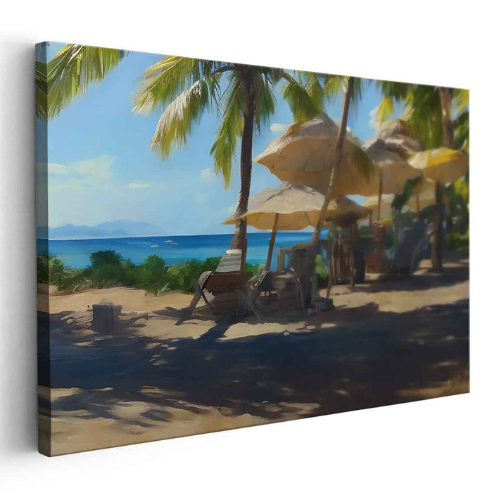 Introducing 'Tropicale Fusion,' an enchanting canvas art print that whisks you away to a peaceful tropical haven, where the sun-kissed beach radiates a golden warmth, and the gentle waves caress the shore. This captivating artwork captures a scene adorned with charming thatched umbrellas and inviting lounge chairs, beckoning you to unwind and bask in the tranquil setting.