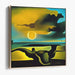 The artwork features an otherworldly landscape painted in a mesmerizing palette of deep yellows, rich blues, and subtle greens that dance harmoniously across the canvas. At the heart of the scene, a radiant celestial body—whether a sun or a moon—hangs low on the horizon, casting an ethereal glow that bathes the surreal setting in a mystical light.