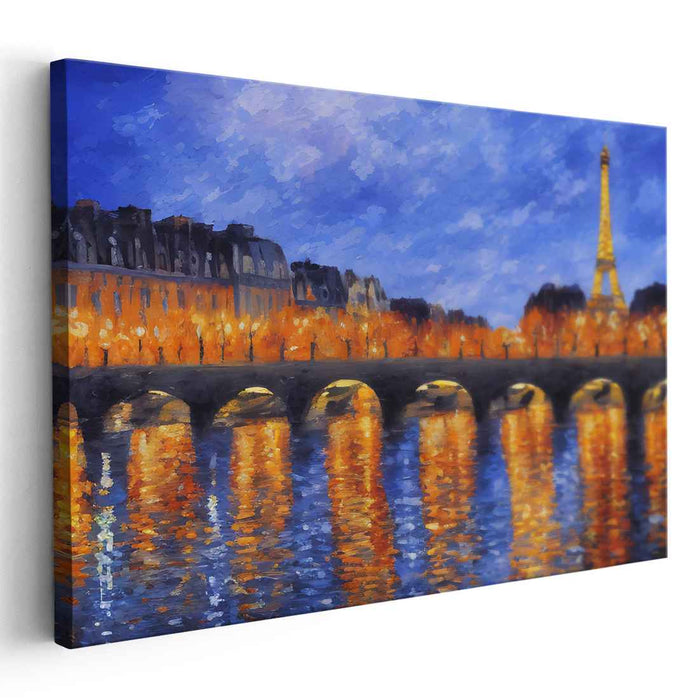 Introducing "Twilight Glow Along the Seine: Illuminated Evening by the Seine," a mesmerizing landscape canvas art that encapsulates the romantic allure of Paris, focusing on the iconic Eiffel Tower against a breathtaking evening backdrop. This captivating artwork features a picturesque scene of a bridge spanning the Seine River, aglow with the shimmering lights of streetlamps casting enchanting reflections on the water's surface.