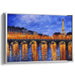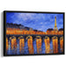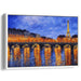 The painting immerses viewers in a twilight ambiance, with a sky painted in deep blues and purples, hinting at the onset of nightfall. The warm golden tones that bathe the buildings and trees provide a striking contrast to the cool hues of the sky and river, creating a harmonious interplay of colors. The primary colors of this piece are rich blues and shimmering golds, complemented by subtle hints of orange and purple that add depth and dimension to the composition.
