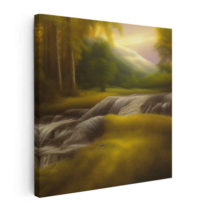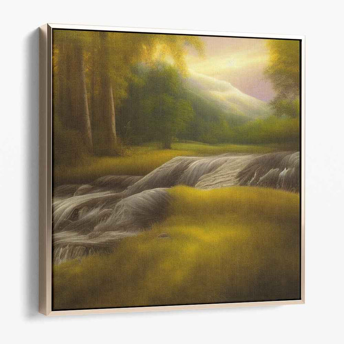 Immerse yourself in the tranquil beauty of 'Twilight Glow Serenity,' a mesmerizing landscape painting that transports you to a serene morning by a gentle river. This artwork beautifully captures the gentle glow of sunrise filtering through the lush trees, enveloping the scene in a warm, golden light.