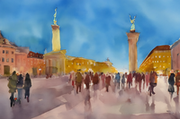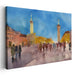 Introducing 'Twilight in the City Square: A Watercolor Impression,' a vibrant cityscape canvas art that captures the bustling energy of urban life in the soft, enchanting light of twilight. This mesmerizing artwork transports viewers to a lively city square, skillfully blending impressionistic and watercolor techniques to depict the essence of everyday urban existence.