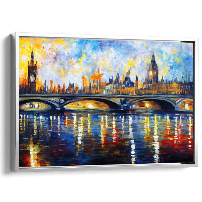Introducing 'Twilight Reflections: Impressionist Cityscape at Dusk,' a mesmerizing canvas art print that transports viewers to a bustling cityscape at the magical hour of dusk, where the setting sun bathes the scene in golden hues, creating a luminous spectacle. This enchanting artwork may evoke images of an iconic city overlooking a river, reminiscent of the architectural marvels along the River Thames.
