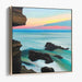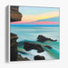 'Twilight Sea Serenade: Coastal Sunset Canvas Art' presents a mesmerizing coastal sunset scene, where the meeting point of the horizon and the sea forms a tranquil backdrop. The soft, pastel colors of the sunset reflect in the calm waters, creating a sense of harmony and peace. The rocks jutting out of the water add a touch of rugged beauty to the otherwise serene setting, balancing the ethereal with the grounded.