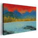 Introducing 'Twilight's Watercolor Serenity: Serene Lake at Sunset,' a mesmerizing canvas art print that transports viewers to a serene landscape, enveloped in the tranquil beauty of a twilight scene. This captivating artwork captures a serene lake reflecting the sky's twilight hues, embraced by a lush forest ablaze in brilliant autumn colors. The backdrop showcases grand mountains under a fiery sky painted in deep red and orange tones, evoking the enchanting moment of sunset.