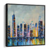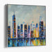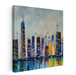 Introducing "Urban Brushstrokes Dance," a modern impressionist cityscape canvas art print that mesmerizes viewers with its dynamic depiction of a bustling urban skyline. This captivating artwork showcases towering skyscrapers reflecting upon the water's surface, creating a mirror-like effect that amplifies its visual impact.